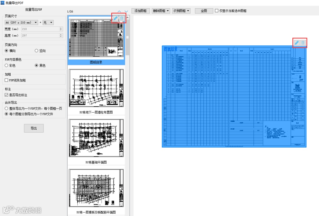 根据实际情况,还可以选择每个图框分别导出为1个PDF文件,一次批量导出多个单张PDF,是否导出标注内容等。