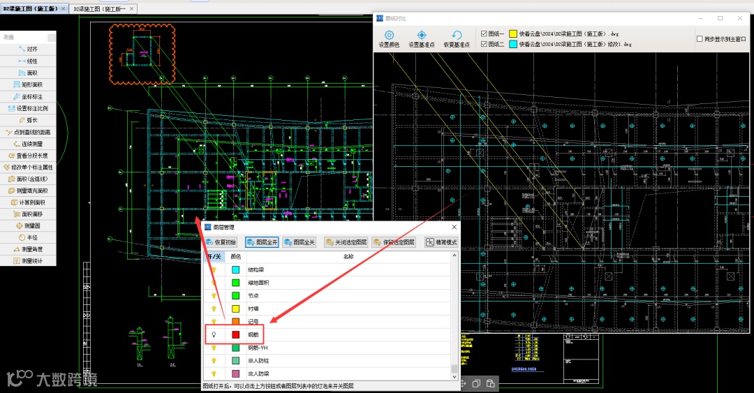 而且测量一下两张图纸上的差异部分、以定量看出图纸有多大的变动,便于后续计算差异工程量,图纸对比也能一键解决。