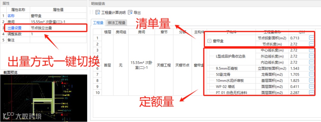 我们预算员最关心的是什么?当然是工程量!灯槽、窗帘盒等位置可能单独列项,也有可能造型并入到天棚、地面、墙面材料中出量,出量方式一键切换,核对检查时量模联动,前所未有的清晰!