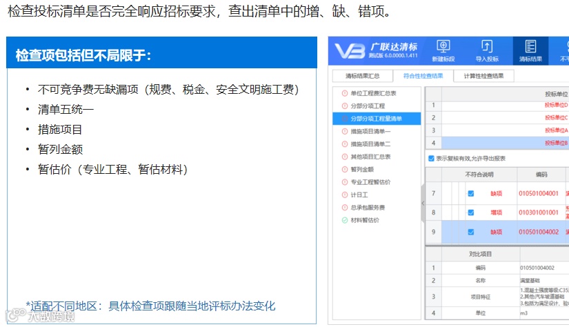 软件可按照对接地区的评标办法,对导入的投标清单与招标清单进行一一对应、考点式的响应性检查,检查出是否存在增项、缺陷、错项。