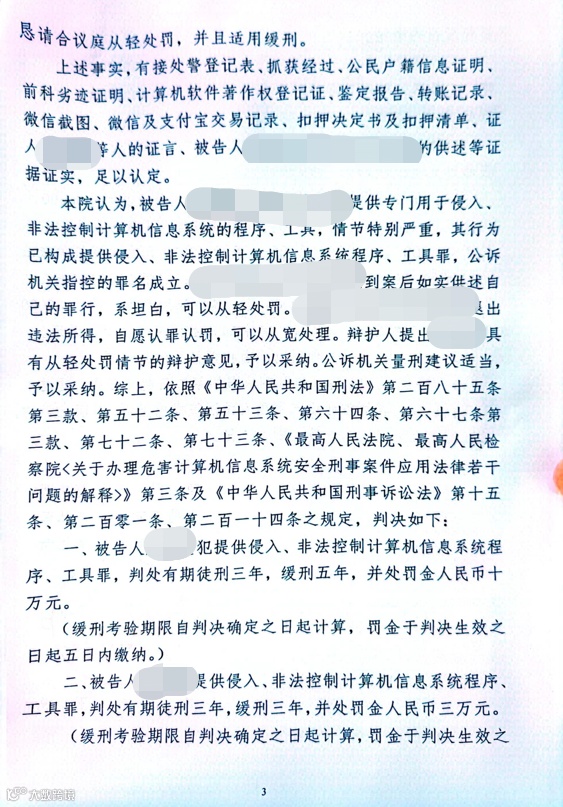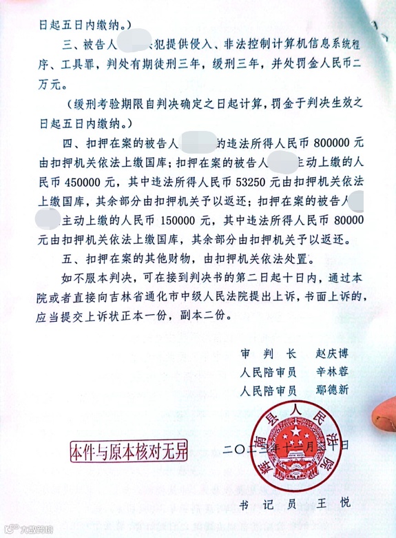 同年11月,吉林省辉南县人民法院公布刑事判决书,三名被告人以非法获利为目的,编写并出售能够屏蔽广联达科技股份有限公司出品的计量计价软件系统的“雪花”补丁,违法所得共计933250元,构成提供侵入、非法控制计算机信息系统程序、工具罪。法院生效判决结果为:三名被告人均判处有期徒刑三年,并处罚金十万元、三万元、两万元,扣押违法所得。