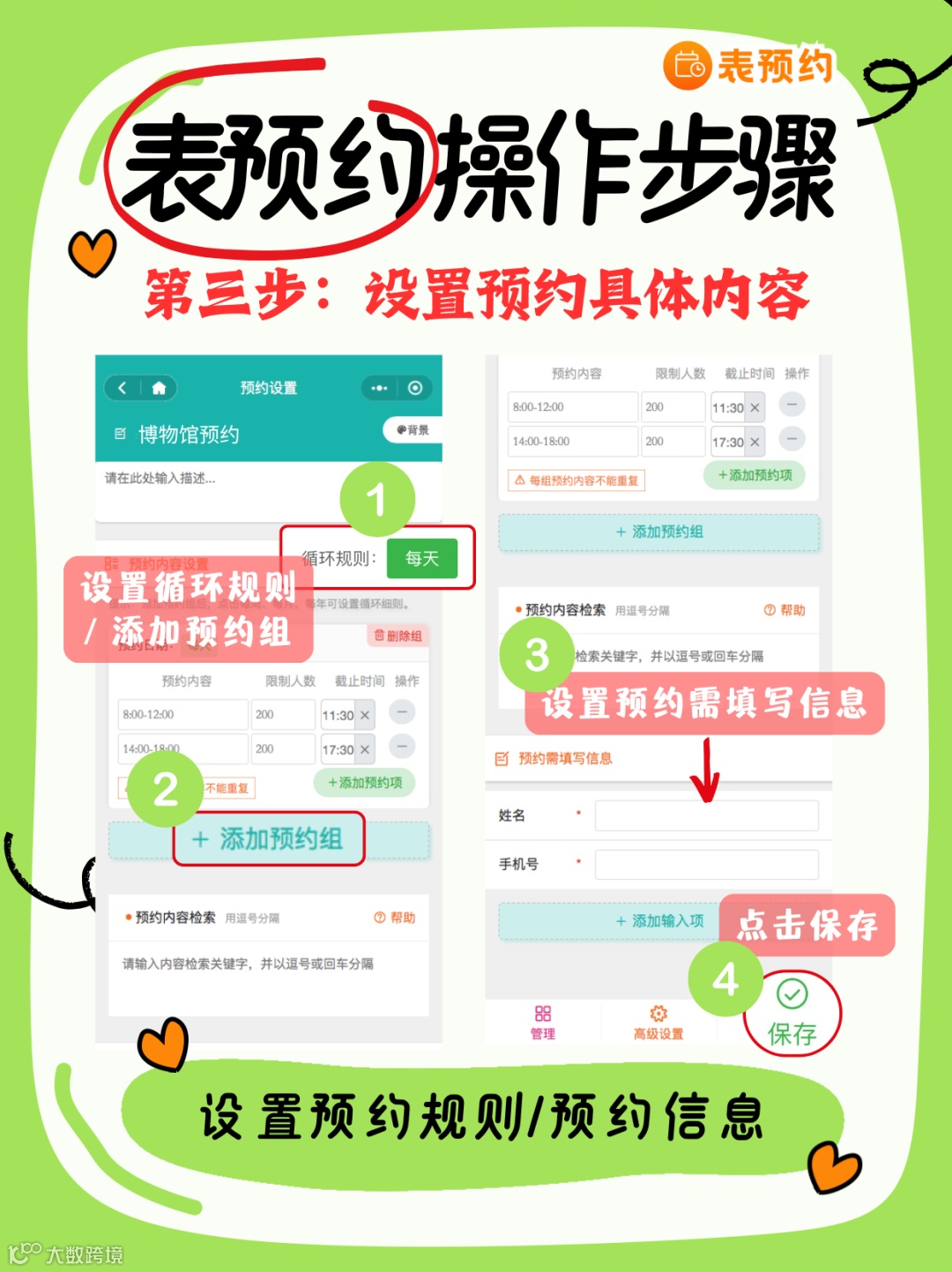 3、先设置循环规则、添加预约组(可自定义预约内容和限制人数),再设置预约时需填写的信息(多种信息类型,不能重复预约,有效性验证),点击保存即可完成创建。