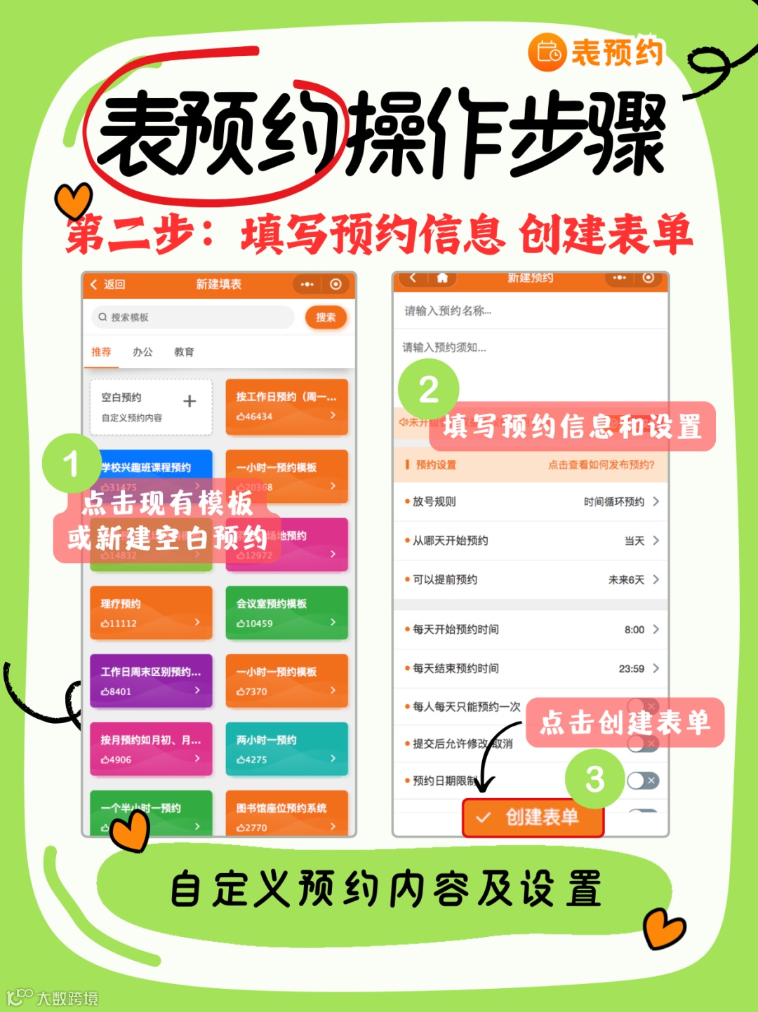 2、选择空白预约,填写预约名称、预约须知和预约具体设置(设置预约具体时间、每天可预约时间,时期限制等),点击创建表单。
