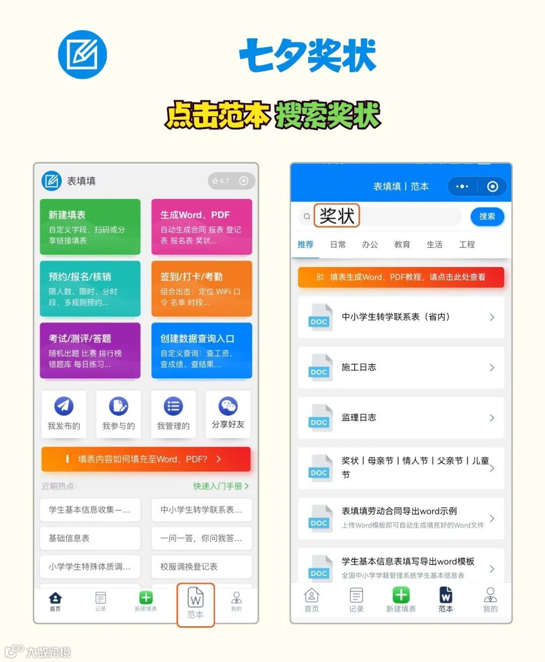 第二步:打开"表填填"点击范本,搜索"奖状",选择适合的模板。