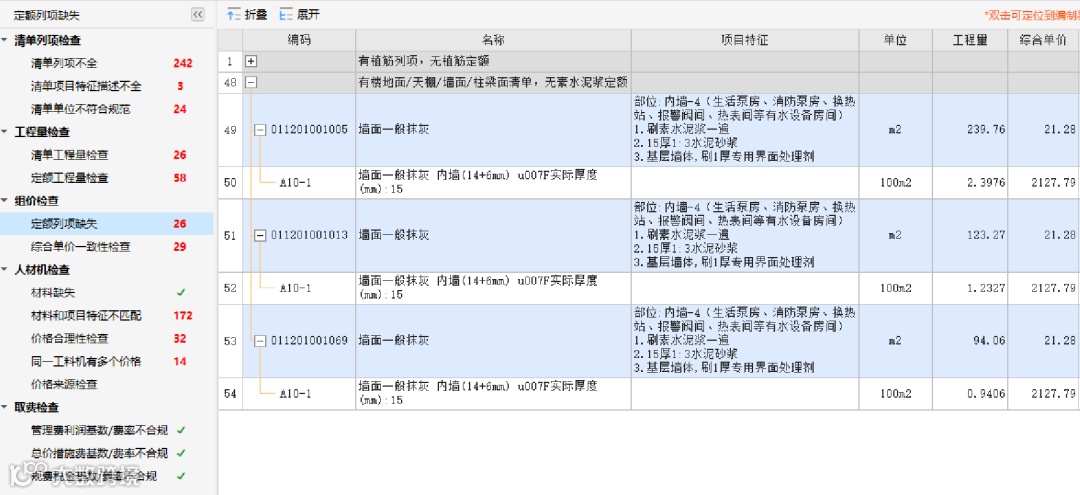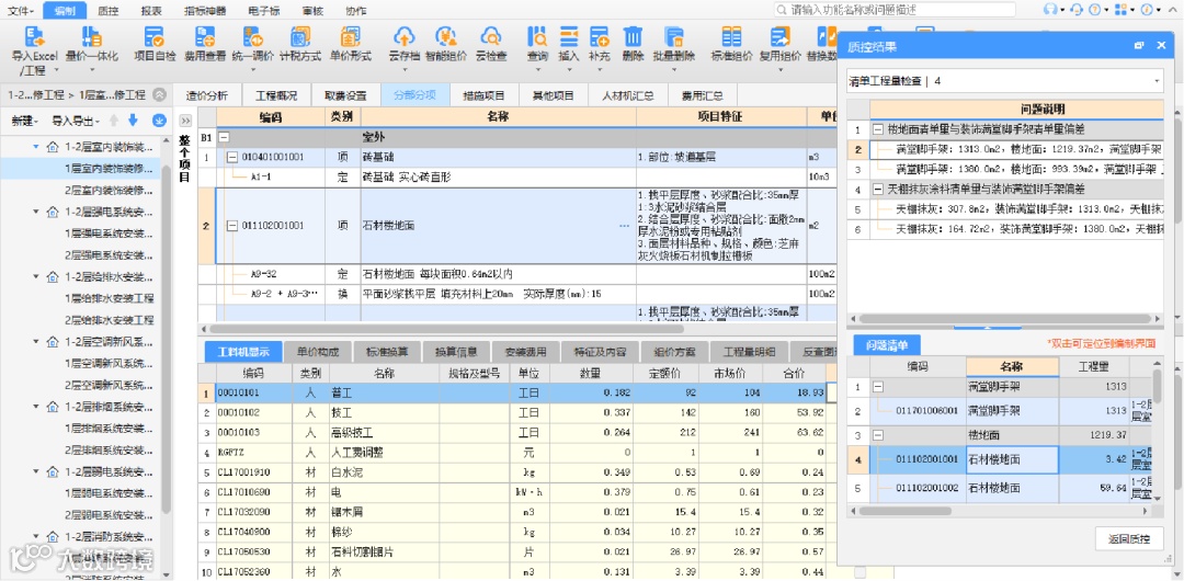 质控所有问题,均可双击返回定位至对应清单/子目/人材机进行快速修改。