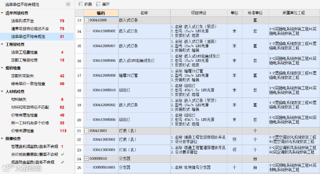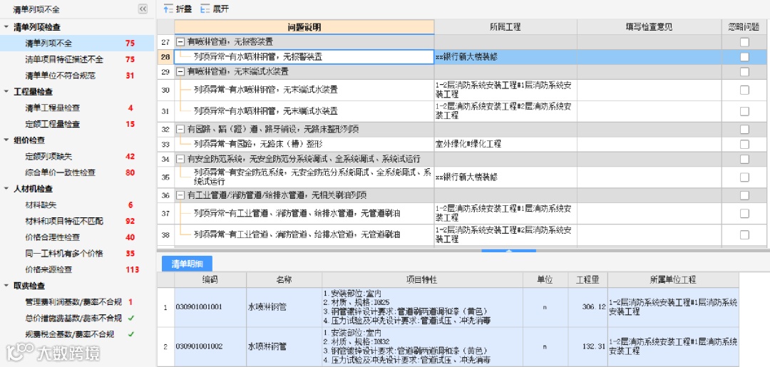 通过清单间业务逻辑关系,自动判断清单工程量是否存在异常,保证清单工程量正确性。