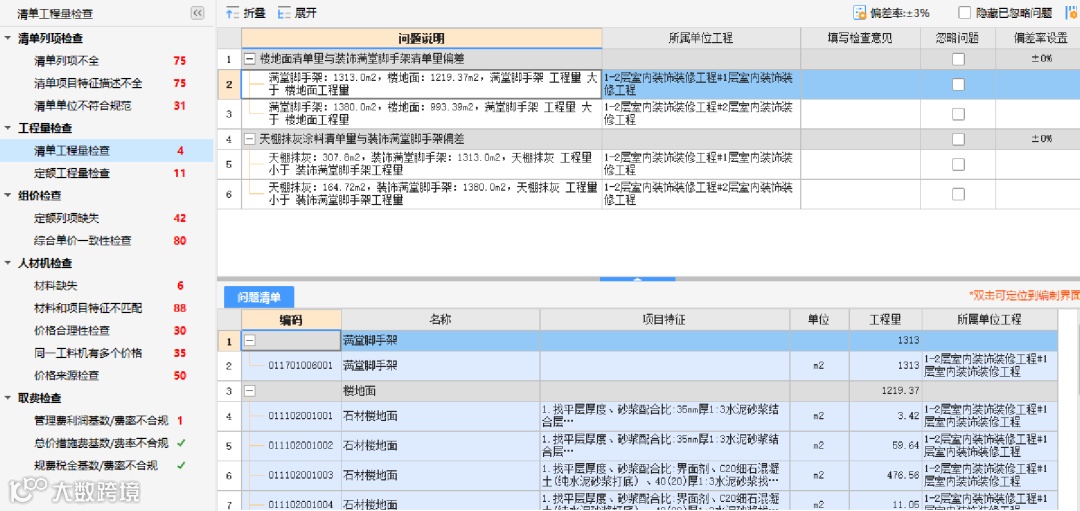 质控会检出并提示,且下方问题清单自动显示:满堂脚手架与楼地面工程量、汇总量与明细量;双击即可定位至问题清单查询。