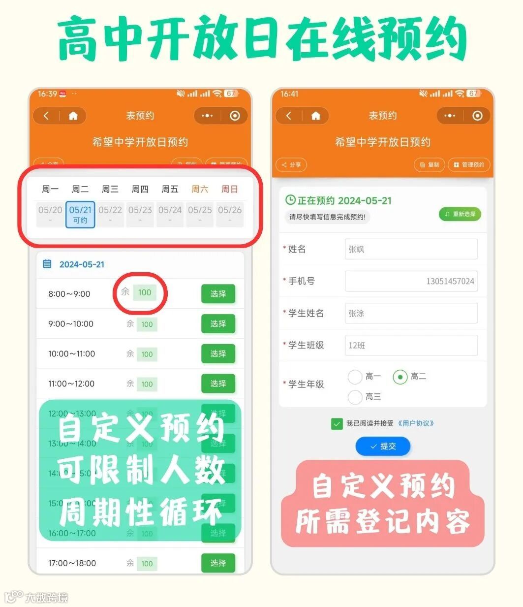 现在有一款在线预约小程序——表预约,可嵌入学校公众号,家长或学生,进入公众号主页,即可点击进入预约页面,查看当前时间的剩余预约人数。填写个人信息后即可完成在线预约。