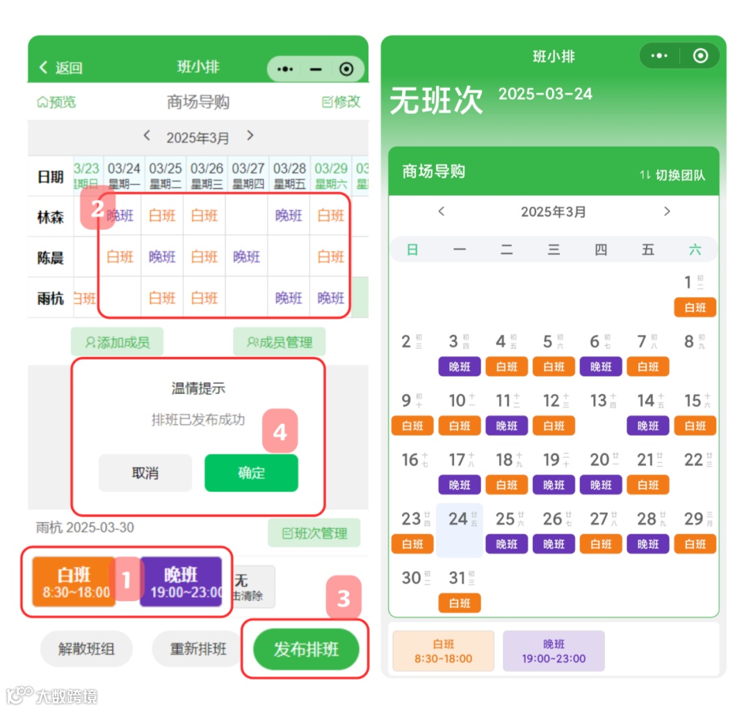 选择班次并插入到对应的日期,点击发布排班,即可发布成功并查看排班详情。