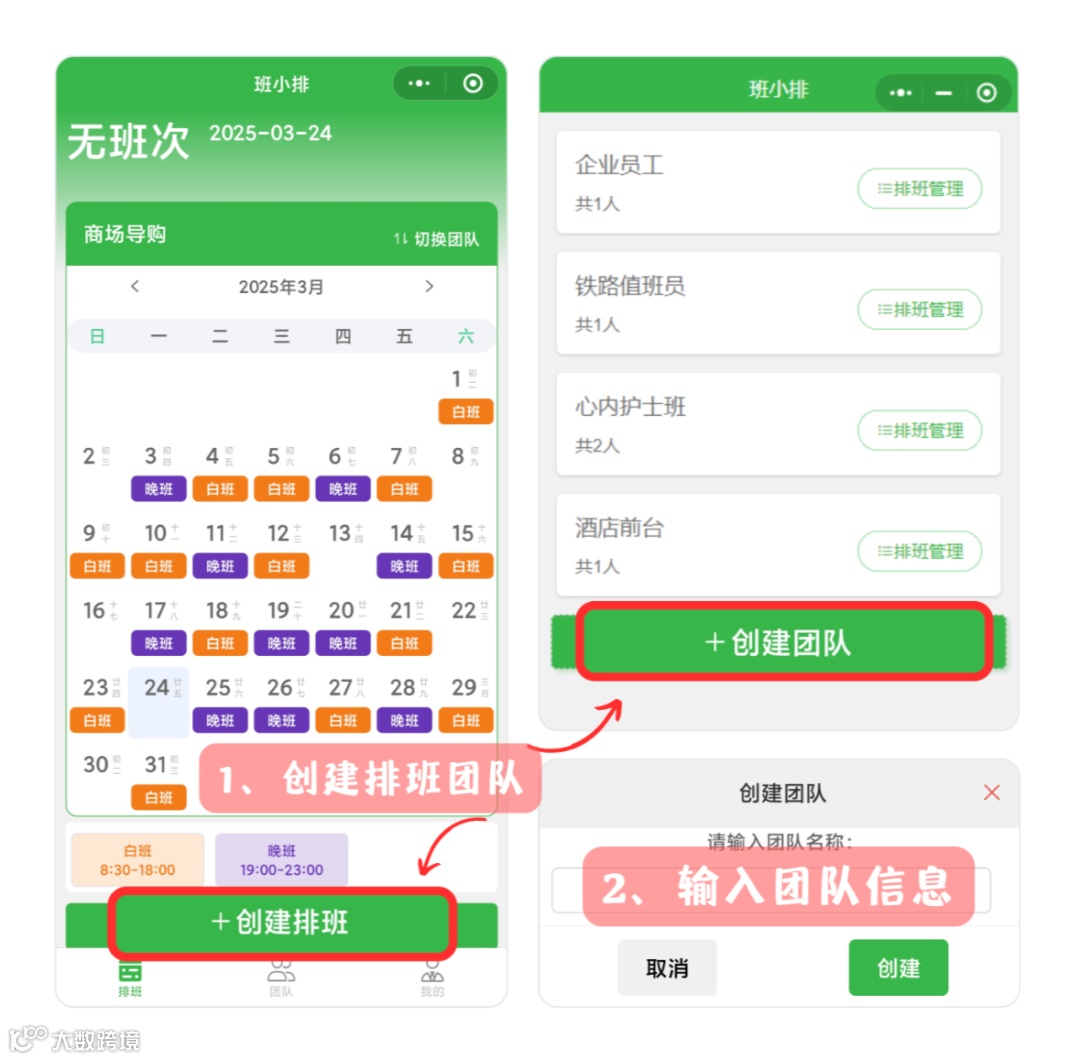 导读:点击创建排班,输入团队名称并创建。选择班次并添加到对应日期,点击发布即可完成排班。