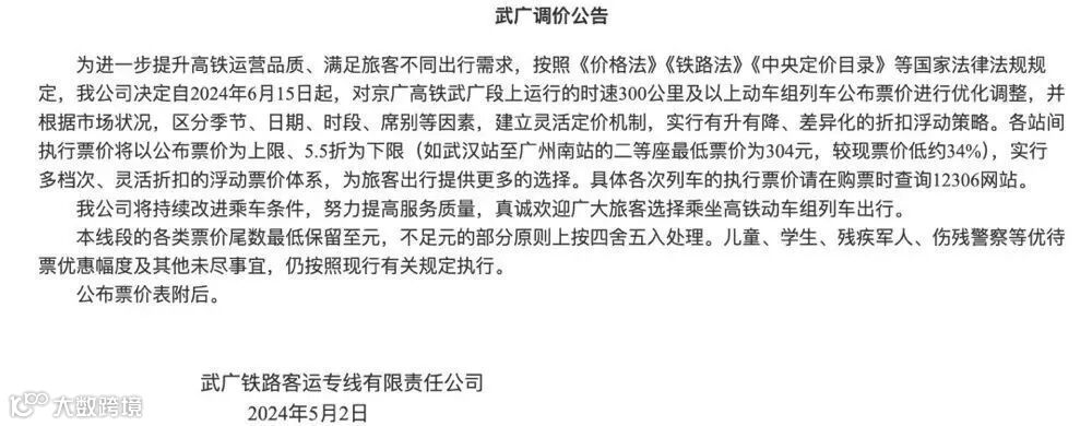 近日,铁路12306官网发布调价公告,决定自2024年6月15日起,对京广高铁武广段、沪昆高铁沪杭段、沪昆高铁杭长段、杭深铁路杭甬段上运行的时速300公里及以上动车组列车公布票价进行优化调整,并根据市场状况,区分季节、日期、时段、席别等因素,建立灵活定价机制,实行有升有降、差异化的折扣浮动策略。