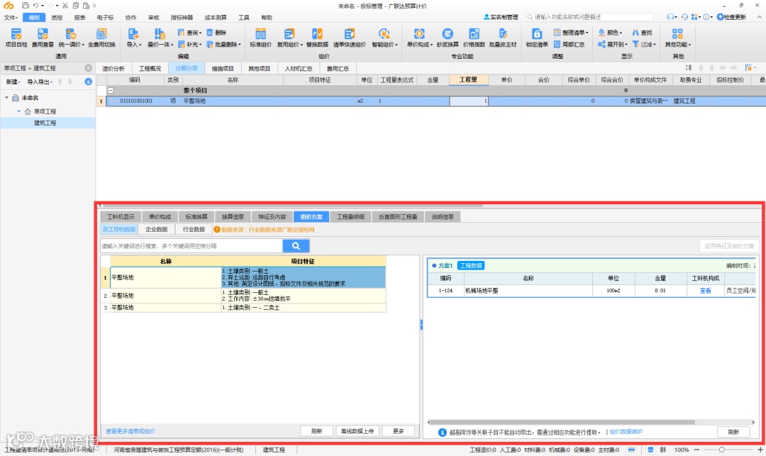 步骤四:属性窗口提供了组价方案窗口,此窗口中内容分为员工数据(该数据就是步骤二上传数据)、企业数据和行业数据三部分;组价方案窗口左侧显示出不同的项目特征方案;窗口右侧显示项目特征方案对应的不同组价方案;可根据工程实际及自己存档数据的情况复用个人数据、企业数据和行业数据中的组价方案。
