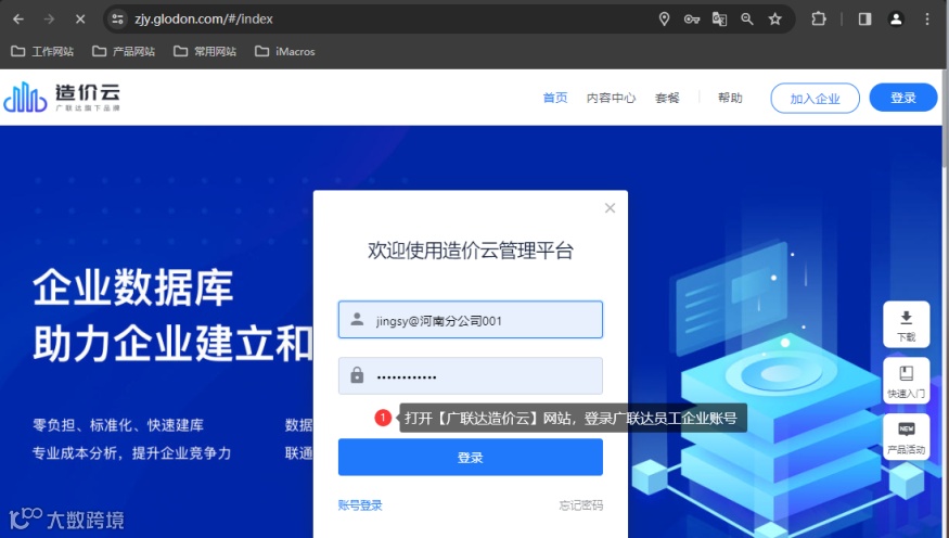 步骤一:登录【广联达造价云管理平台】,输入登录公司分配的员工账号。