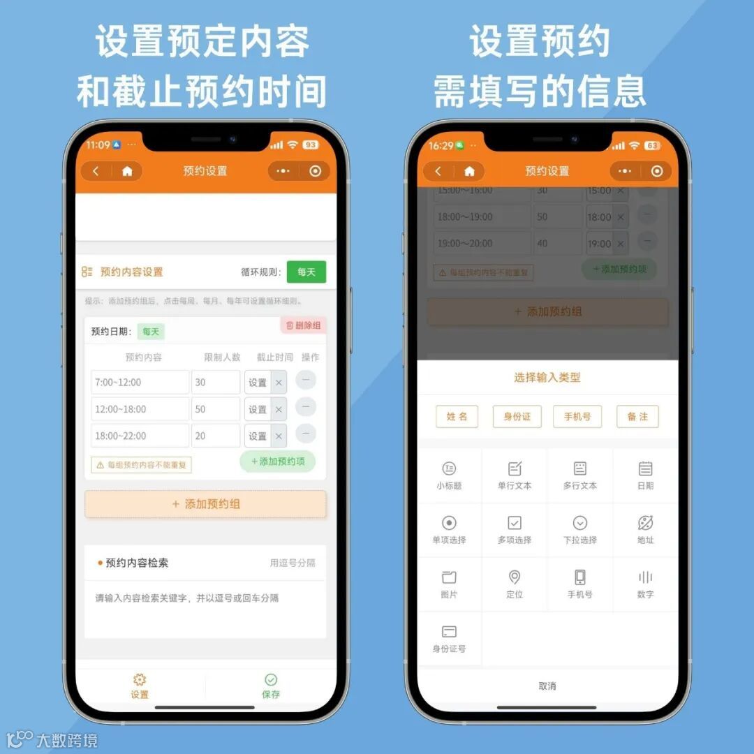 设置预约时用户需要填写的信息(比如姓名、电话、是否第一次来,预约人员号码),设置预约需要填写的信息时可以选择多种类型(单行文本、多行文本,单选,多选,图片,地址,定位等),方便商家整理客户数据。