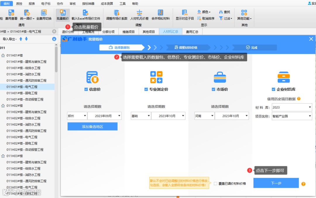 【操作方法】批量载价功能-可以直接载入广材网中的信息价,市场价、专业测定价、企业材料库中的材料价格,可以作为调价的数据;同时可以通过企业数据积累形成企业材料库,匹配对应材料直接生成企业自身价格,完成投标文件的编制。