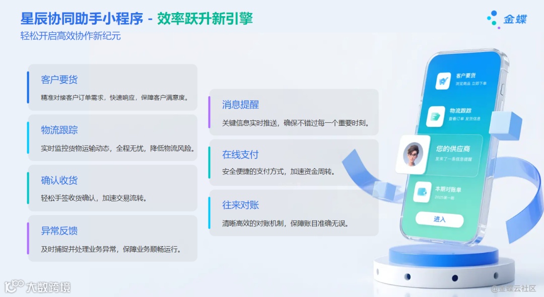 “协同助手“模块致力于帮助企业优化客户服务的协作流程。客户可通过协同助手小程序便捷下单并在线支付,商家可管理订单并处理异常反馈。物流跟踪功能使客户能实时监控货物状态。确认收货功能含自动签收、签名确认及异常反馈处理,提升物流效率。消息提醒服务确保信息及时传达,客户对账功能简化财务流程。整体而言,协同助手优化客户体验,提高企业运营效率,增强客户满意度。