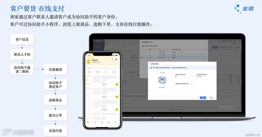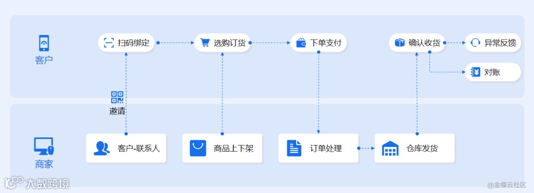 在商家端,商家可以通过客户联系人管理、商品上下架、订单处理、仓库发货和客户对账等操作来支持整个业务流程。