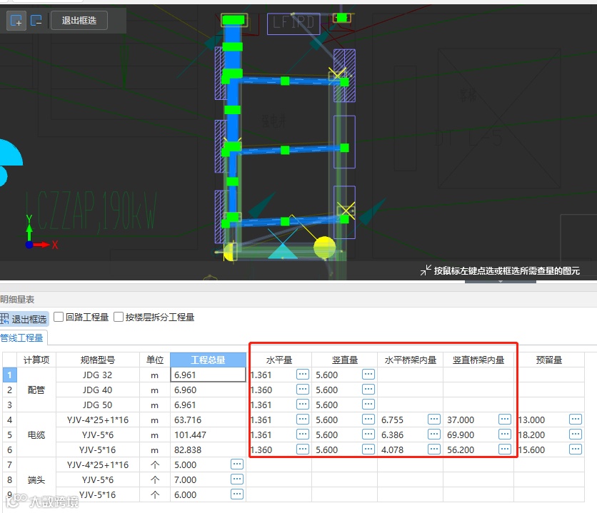 ②可以在报表中汇总出电缆总的工程量以及各楼层的工程量,还可以区分水平量和垂直量。
