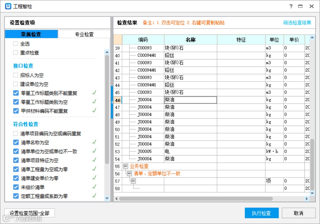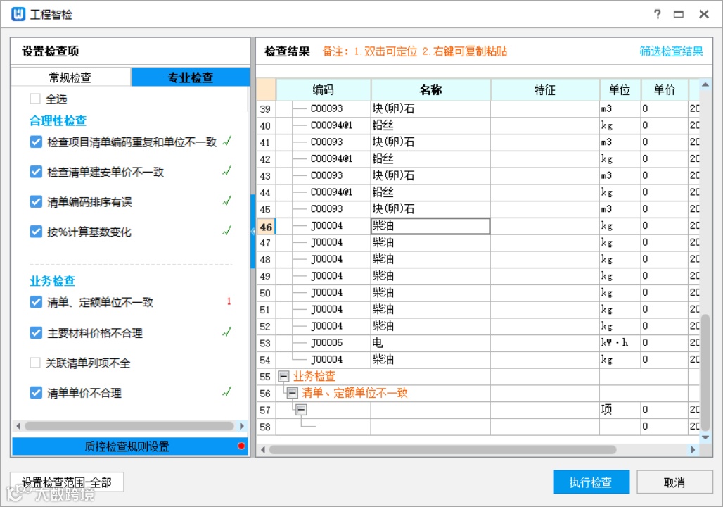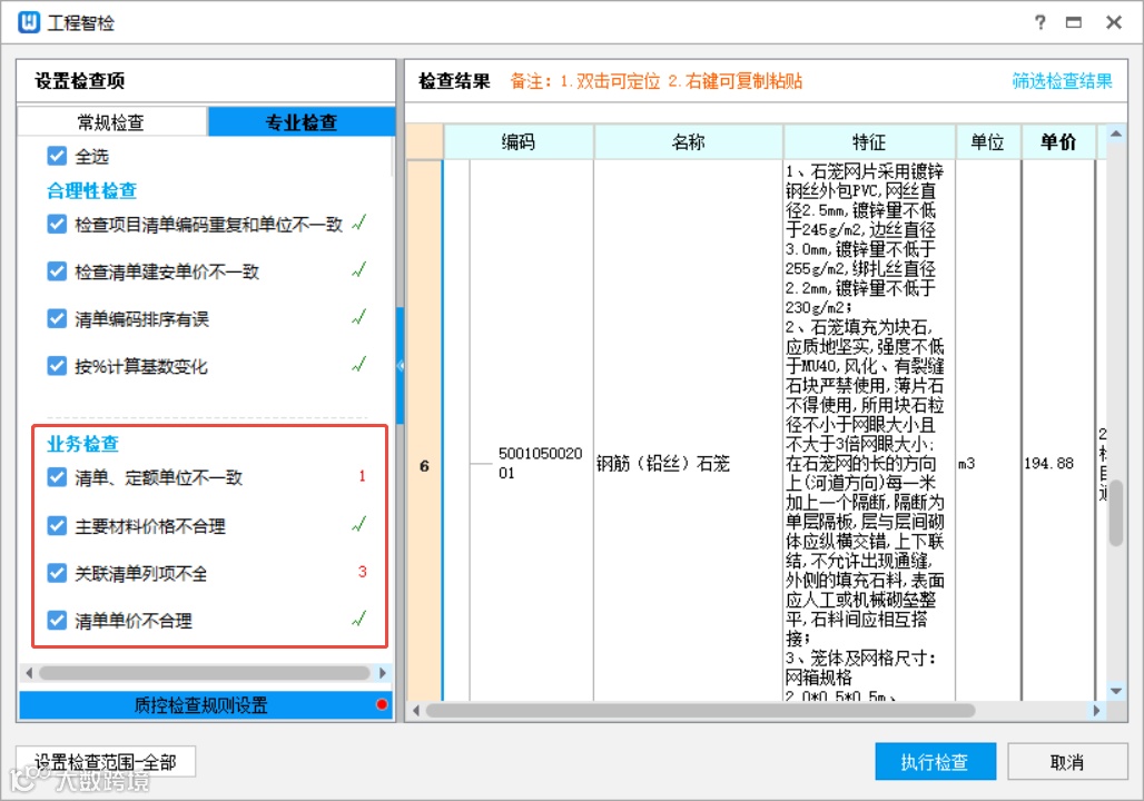“工程智检”将水利造价的核心检查项系统化、标准化,分为 “常规检查” 与 “专业检查” 两大维度: