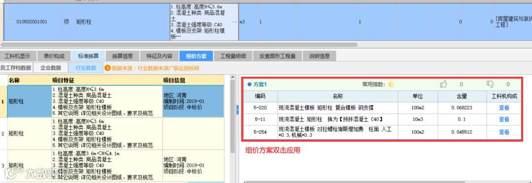 组价编制:会清单项目特征描述只能匹配出组价方案,双击一键应用,组价效率高;