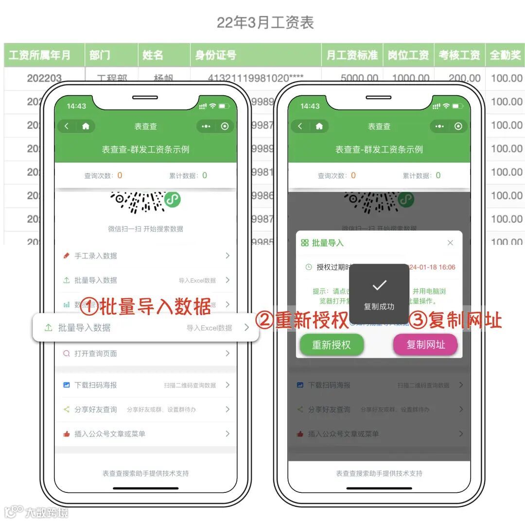 生成小程序:在创建好查询项目并导入数据后,一键生成小程序。可以通过扫描小程序码或者分享链接,让其他人使用小程序进行数据查询和管理。