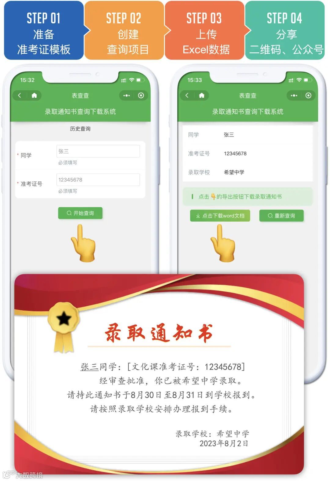 1、教育机构:学校教职员工可使用该小程序制作成绩查询(生成成绩单)、课程表查询(生成课程表)、录取查询(生成电子录取通知书)、分班查询(显示分班信息、班级群二维码等)、准考证查询(生成可下载的准考证)、考场查询(生成考场信息下载)、分配的宿舍查询等。