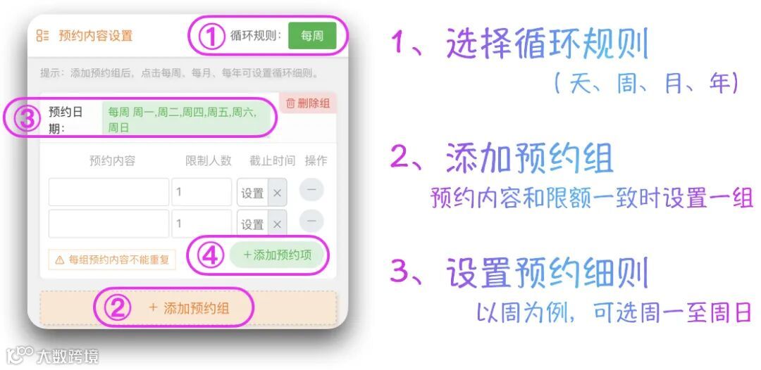 再设置预约内容、限制人数和截止时间即可。(注:此处也可分时段进行限额预约)。
