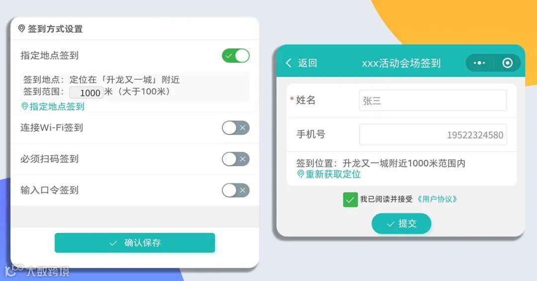指定位置签到:勾选对应的选择框之后,在弹出的选项中设置指定的签到地点以及范围,如果签到人员不在位置范围内将无法完成签到。