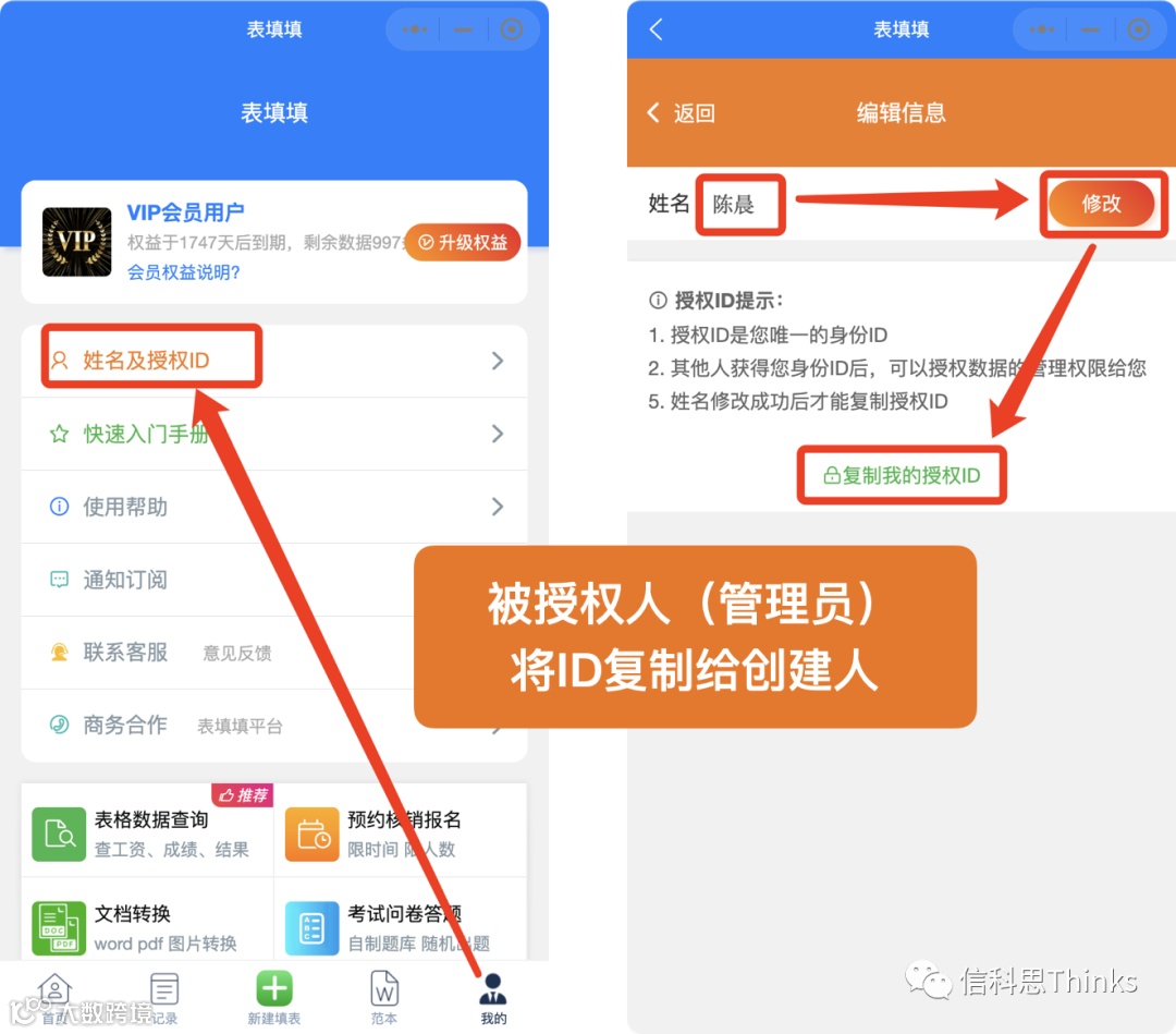 1、各班老师操作:进入表填填(点击此处进入),点击【我的】、【姓名及授权ID】、修改姓名,复制我的授权id。