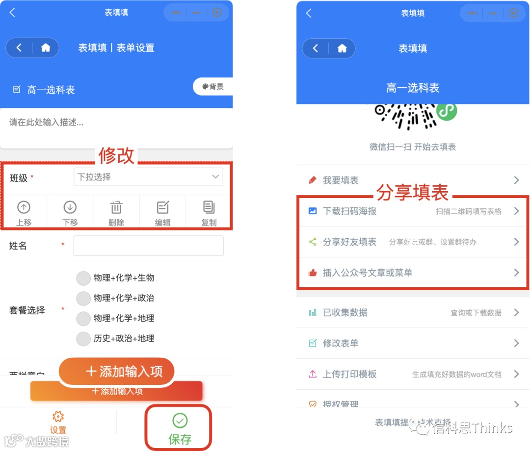 3、可在表单基础上新增或修改填写内容,设置完成点击「保存」,再分享给同学们填表就可以了。