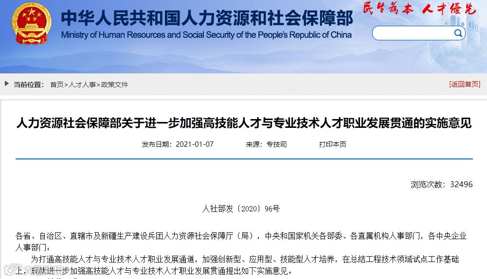 21年年初人社部发布了《关于进一步加强高技能人才与专业技术人才职业发展贯通的实施意见》的通知。通知强调推进职称制度与职业资格、职业技能等级制度有效衔接。