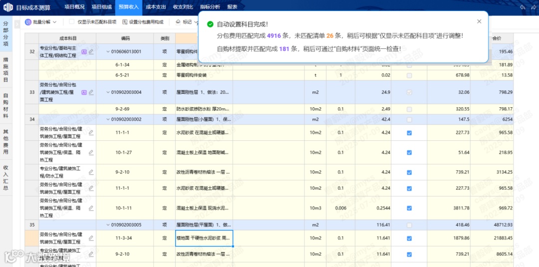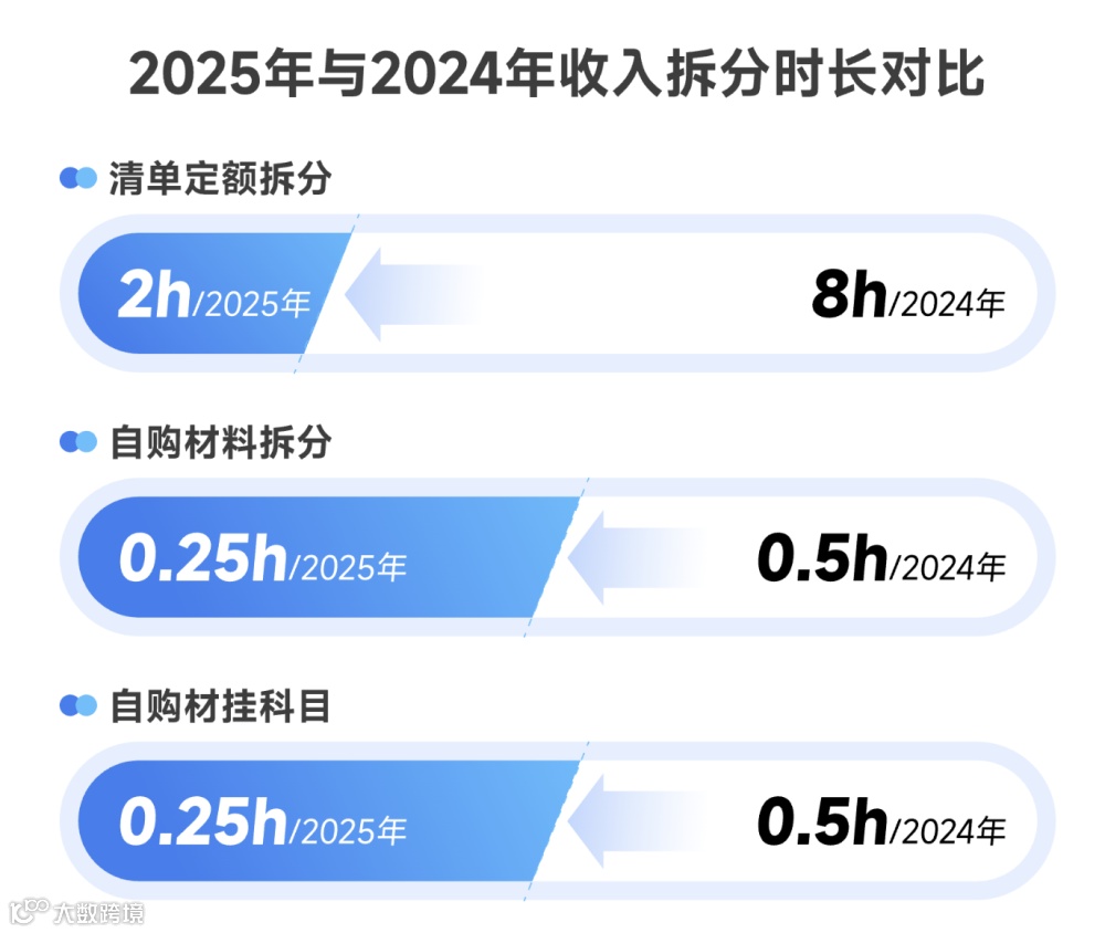 25年,在“成本测算”软件中,通过AI智能分解一键完成标价分离,快速检查调整即可。同样以2000条清单的项目为例,拆分分包的时间缩短至2小时,拆分总包自购材料并给材料分类仅需要半小时。