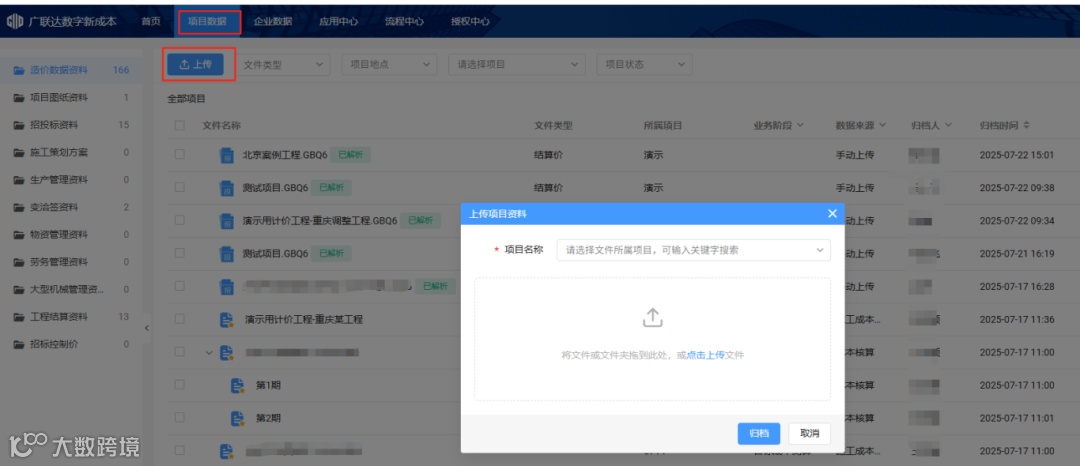 积累: Excel询价单导入分库(项目/用途/专业/时间);上传GBQ/云计价文件,新成本平台自动解析入库。