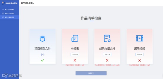 在确认提交页面,系统对已提交的模型和资料进行统计校验,单模块下“已上传”参赛资料,此模块下显示“已上传”字样,“未上传”参赛文件,此模块显示“未上传”字样。
