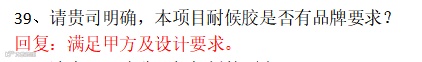 根据此情况及时反馈至甲方,同时提报价格等依据。甲方收到函件后给出的第一回复为招标时未约定品牌,且答疑回复里明确说需但“需满足项目及设计要求”(见下图),耐候胶不做费用调整。