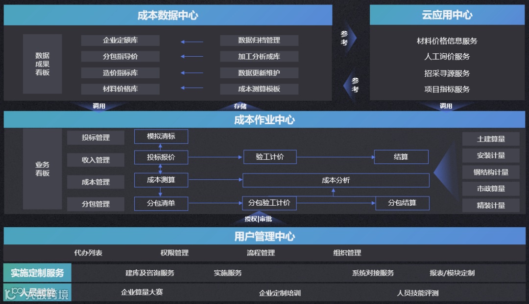面向施工企业精细化管理的诉求,广联达数字新成本解决方案以企业成本数据积累与应用的闭环打通为核心,赋能企业实现数据资产化、作业高效化、决策智能化,方案以成本数据中心、成本作业中心、用户管理中心为整体架构,实现数据资产上的权责清晰、业务上的测投一体、管理上的数据动态统计,解决企业成本管理基线不清晰、成本测算效率低、动态成本数据统计难等业务问题,助力施工企业达成精细化成本管理的目标。