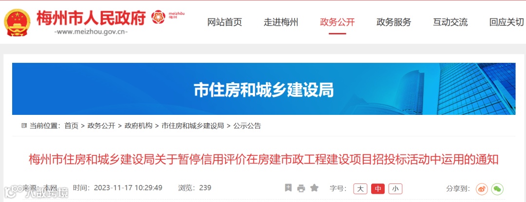 为做好开展妨碍建设全国统一大市场有关问题的整治工作,切实为各类企业营造公平竞争的市场环境,根据国家发展改革委办公厅《关于规范招标投标领域信用评价应用的通知》关于“不得将特定行政区域业绩、设立本地分支机构、本地缴纳税收社保等作为信用评价加分事项”的精神,结合《梅州市社会信用体系建设工作联席会议办公室关于规范招标投标领域信用评价应用的通知》要求,自11月20日起,对于尚未开标的房建市政工程建设项目,暂停以《梅州市建筑市场信用管理办法》开展的信用评价、信用评分在招投标活动中的应用。