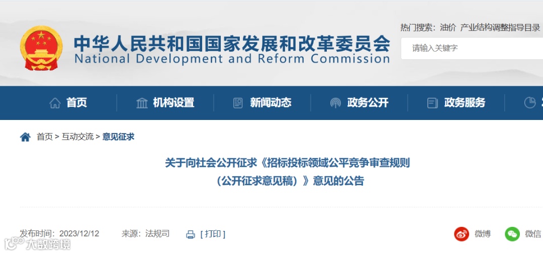 12月12日,国家发改委发布《招标投标领域公平竞争审查规则(公开征求意见稿)》。