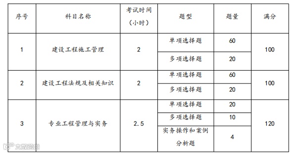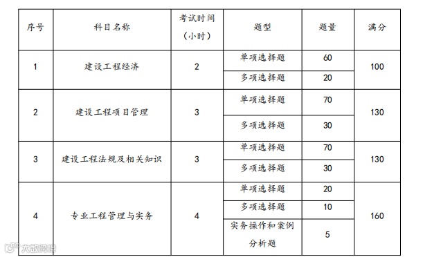 一级建造师考试时间分为4个半天,以纸笔作答方式进行。各科目考试时间、题 型、题量、分值如下:
