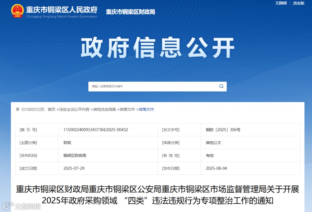 重庆市铜梁区正在开展2025年政府采购领域“四类”违法违规行为专项整治,重点整治“供应商成立多家公司围标串标,投标文件相互混装、异常一致,投标报价呈规律性差异”等行为。