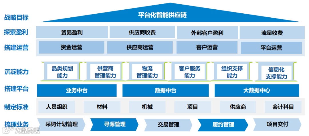 物资供应链建设内容至少要包括以下几点:理业务-定标准-搭平台-沉能力-建运营-探盈利。建设顺序不分先后,最佳的实现方式与数字化转型相同:集团层面统筹考虑建设目标,再依据企业自身管理特性,选择适合的切入点,分段建设。