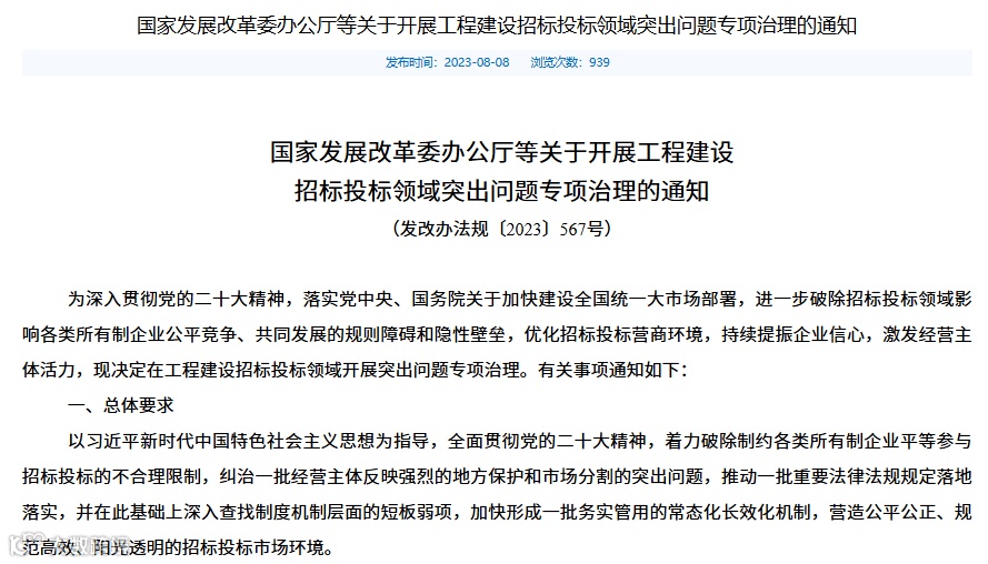 1、2023年7月,国家发展改革委办公厅发布《关于开展工程建设招标投标领域突出问题专项治理的通知》发改办法规〔2023〕567号文。自2023年1月起主要针对招投标活动中,突出的问题进行专项治理,追根溯源问题源头。针对建设项目编制资格预审文件和招标文件、收取投标保证金、组织评标、处理异议和投诉等招标投标全过程中是否存在违法违规情形,进行重点核查,进一步破除招标投标领域影响各类所有制企业公平竞争、共同发展的规则障碍和隐性壁垒,优化招标投标营商环境,持续提振企业信心,激发经营主体活力。