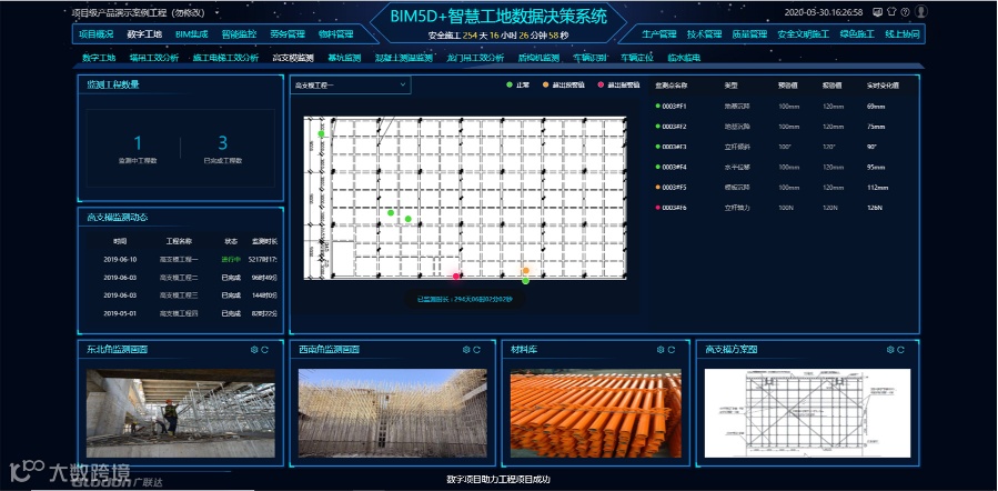 广联达高支模监测系统,实时监测混凝土浇筑过程中,高支模系统的轴压、位移、倾斜等变化情况,超过阈值后,通过系统推送预警信息,同时联动现场报警器,便于管理人员及时整改,有效避免因支撑系统变化过大发生垮塌事故。
