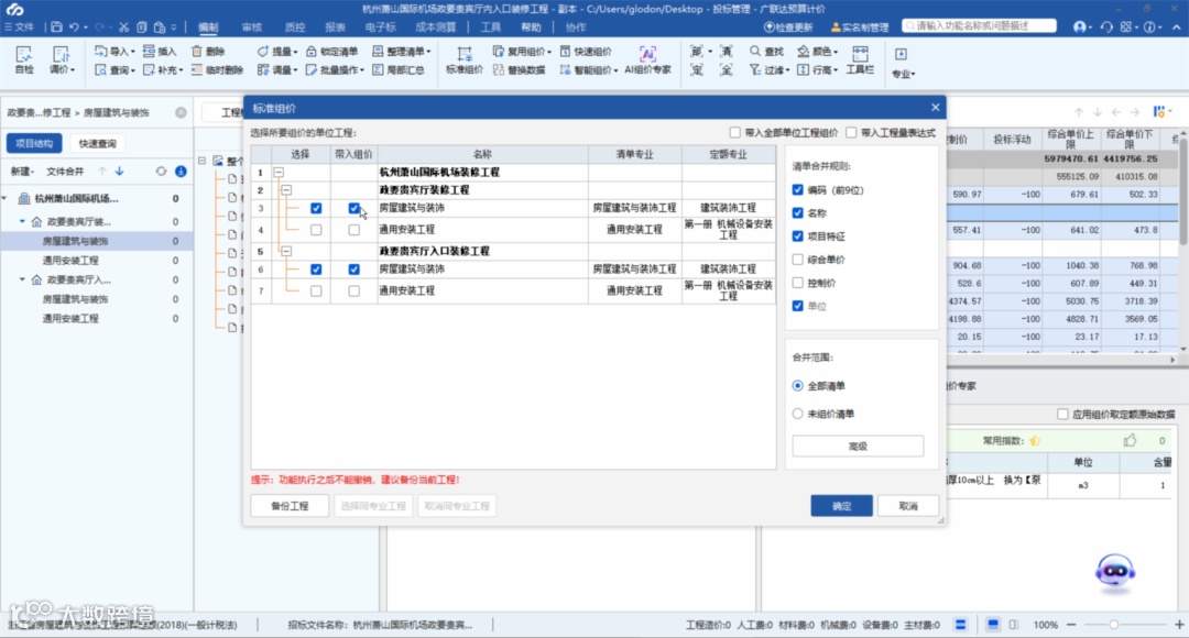 3. 不同分部或单位工程中,需要统一相同清单的组价标准;