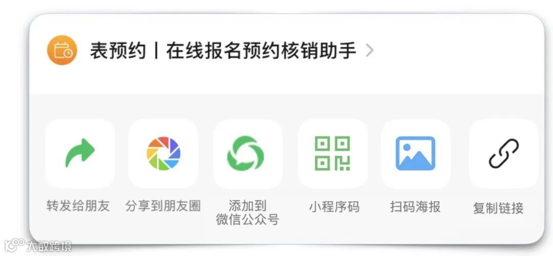 可通过二维码、微信好友、微信群、朋友圈、添加到公众号等方式将预约分享给他人。