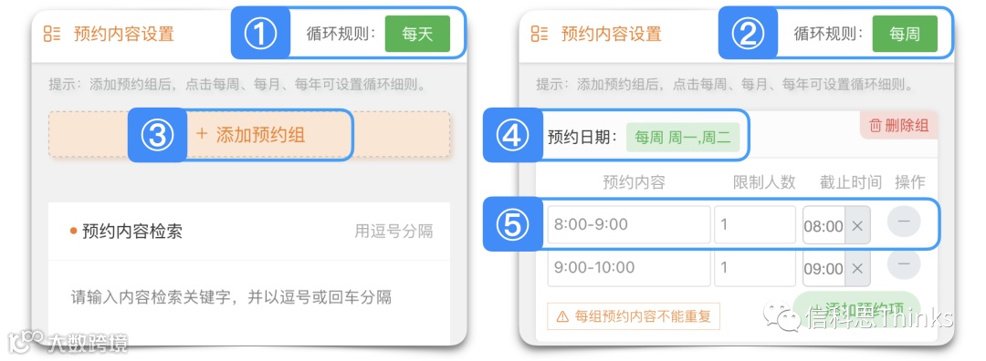 循环规则可选择每天/每周/每月/每年。预约组可添加多个,用于相同规则的预约,如每周一二只有上午可约等。如下图所示。