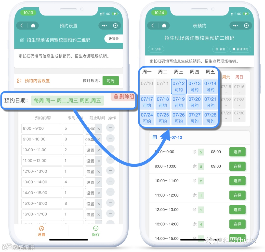 如果仅有工作日举行招生咨询活动,那么循环规则设置「每周」,预约日期选择「周一至周五」,如果周一至周五中的预约内容不同,添加多个预约组即可。