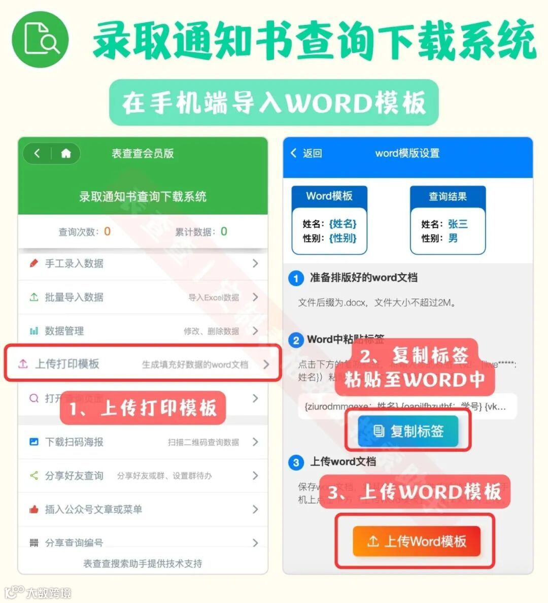 选择“上传打印模版”,点击“复制标签”按钮,将复制的标签文字,代替模版中相对应的文字。最后点击“上传Word模版”。完成录取通知书批量制作的原模版。