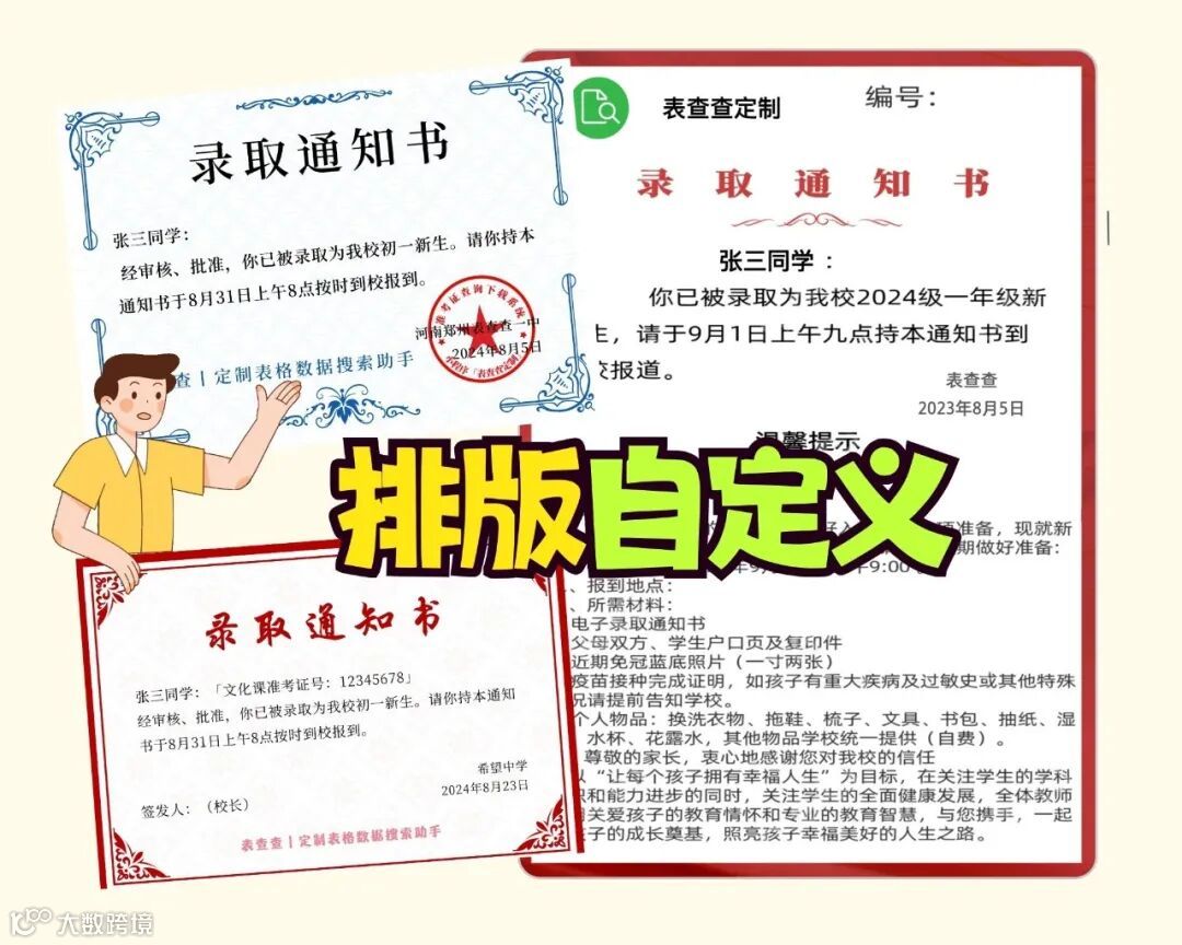 表查查表查查,只需一个Excel文件就能快速查询结果,还能批量地制作录取通知书,主要还能根据自己的需求快速制作录取通知书。一个模版就能完成所有录取学生的录取通知书的制作,通过查询还能快速地下载自己的电子录取通知书。