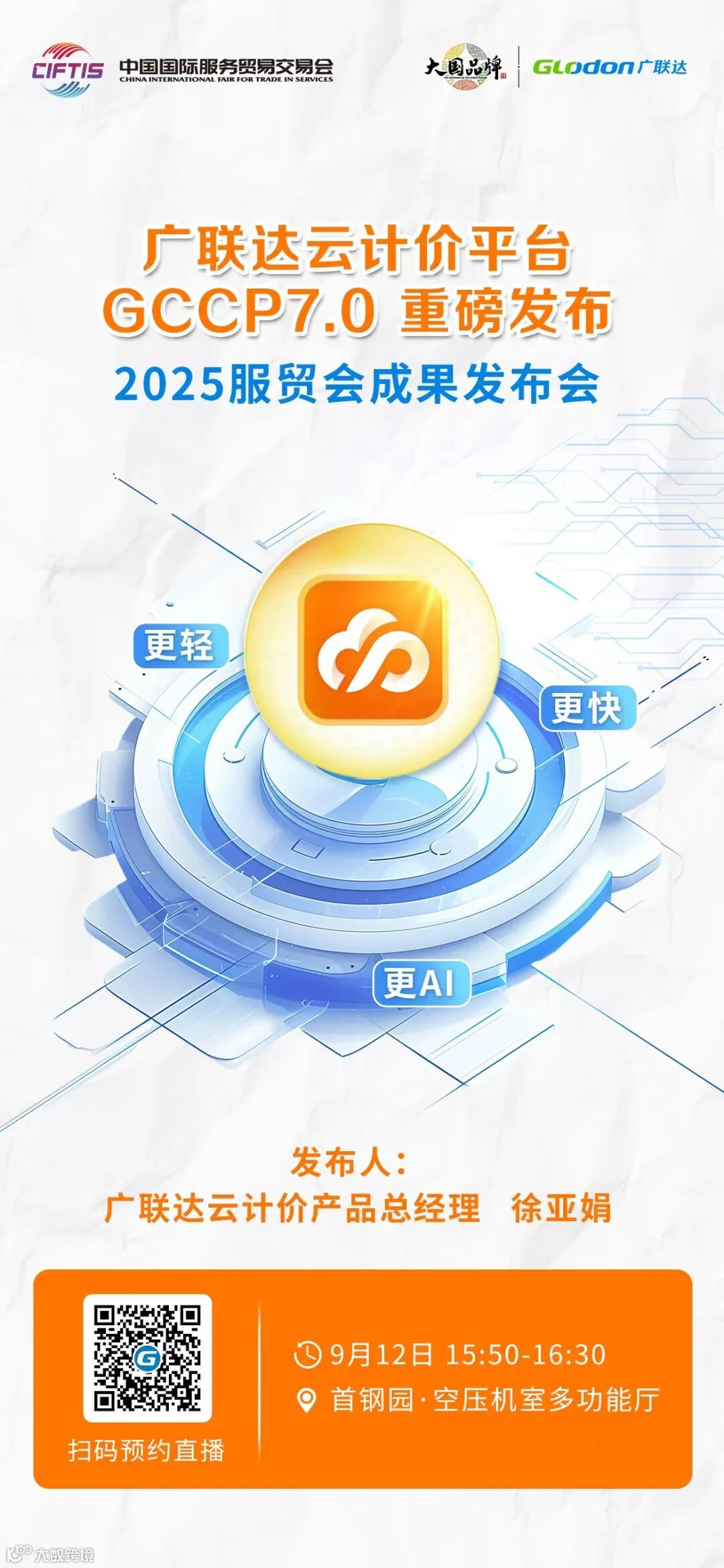 9月12日,2025年中国国际服务贸易交易会(服贸会)成果发布会,建筑行业数字化利器——广联达云计价平台GCCP7.0将迎来重磅发布!